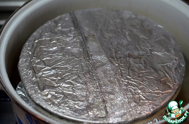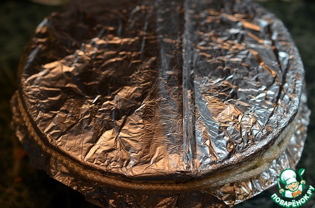 Накрыть пропитанный кекс чистыми бумагой и фольгой.