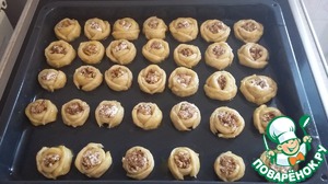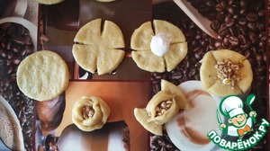 • Тесто раскатать толщиной 3 мм. Вырезать кружочки. На каждом кружочке сделать с четырёх сторон надрезы. На середину кружочка положить пол чайной ложки безе, а сверху немного ореховой начинки. Два противоположных лепестка соединить между собой вокруг начинки. Затем соединить два оставшихся лепестка.