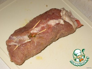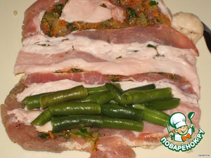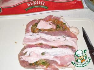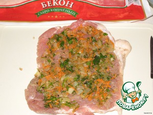 Кусок мяса разложить, поверх мяса сплошь выложить небольшой слой начинки.