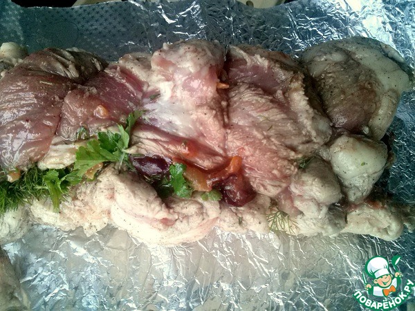 Накройте второй половинкой мяса, перевяжите кулинарной нитью или силиконовыми завязками, заверните в два слоя фольги и поместите на решетку.