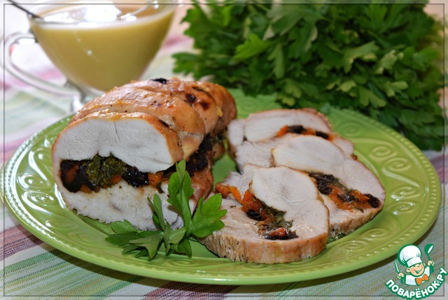 Роскошное мясо! Фейерверк ароматов и вкусов! Курага,чернослив,зелень,апельсиновый соус-все ингредиенты слились воедино и создали идеальное блюдо. Вкусное настолько,что словами передать невозможно. Кстати,холодным нам это мясо понравилось даже больше. Спасибо большое,Дашуня,за этот дивный рецепт-подарок. (честно признаюсь,готовила уже не раз,но...с фото сложилось только сейчас,прости уж...) Готовила и свинину,и телятину,и даже курицу таким образом. Сегодня у нас индейская грудка.