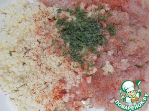Фарш смешать с пшеном, добавить сухую аджику (приправу), нарезанный укроп, соль и перец по вкусу. Перемешать.
