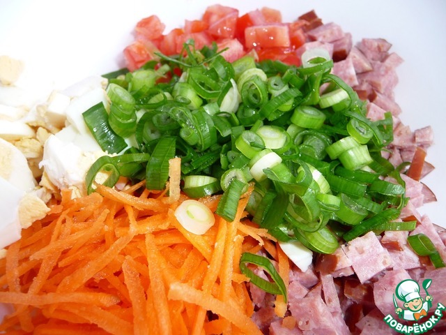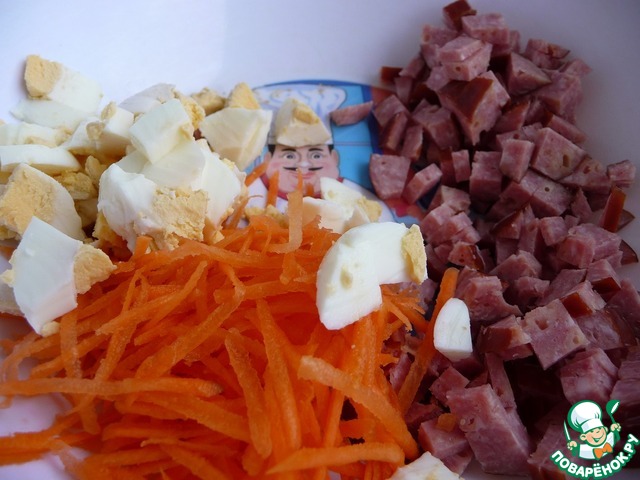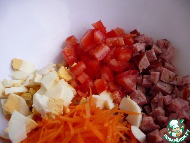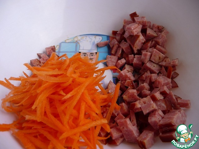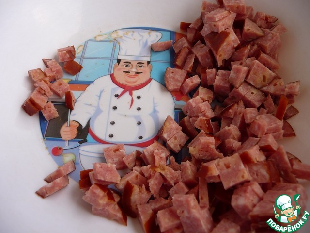 Колбасу нарезать мелкими кубиками.