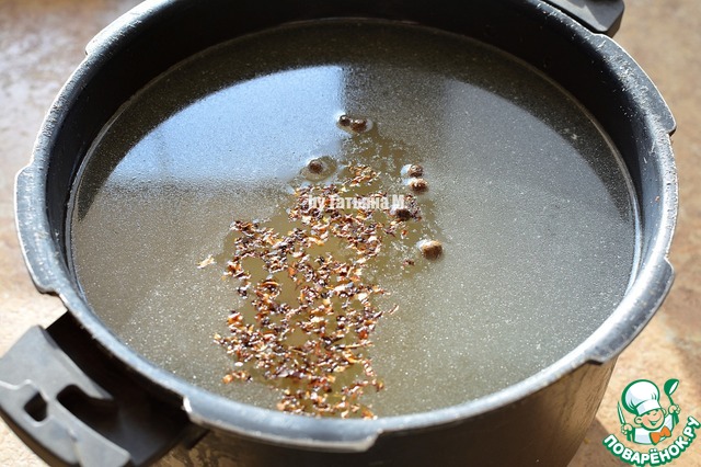 К бульону добавить еще 2 л кипятка, подсолить по вкусу, добавить перец, сушеные помидоры, чеснок;