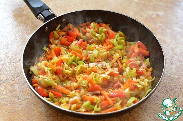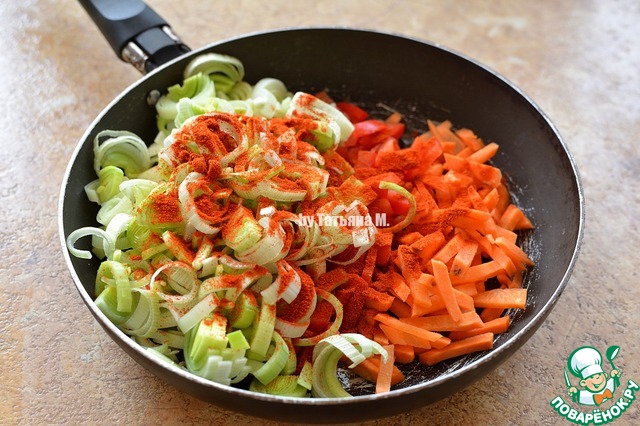 Лук-порей, морковь и перец болгарский порезать произвольно не крупно, выложить в сковороду с маслом, посыпать паприкой;