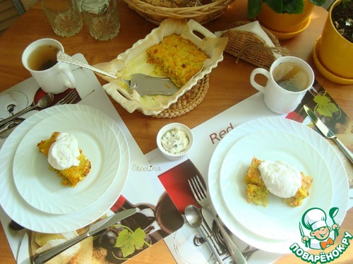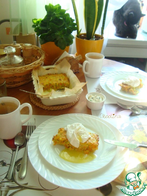 Яйцо-пашот выкладываю поверх запеканки и надсекаю. Желток растекается, как же это вкусно. Не обязательно варить яйца-пашот. Запеканку можно подать с йогуртом натуральным или сметаной. А к завтраку просто сварить яйца "в мешочек".