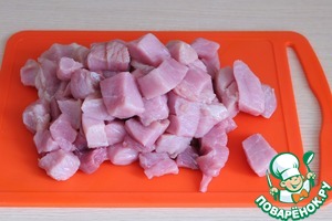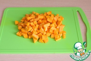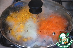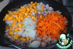 Добавить к мясу нашинкованный полукольцами репчатый лук, морковную соломку, кубики тыквы, добавить 10 горошин душистого перца и воду (1/2 стакана).