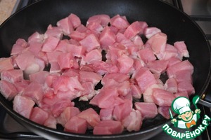 На сковороду добавить 5 ст. ложек растительного масла. Сковороду разогреть. Выложить мясо и обжарить на сильном огне в течение 10-15 мин.