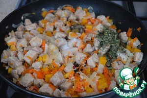 Затем добавить пряную сушеную зелень (1 ч. ложка), черный молотый перец и соль добавить по вкусу. Если водичка выкипела, долить еще 1/2 стакана. Мясо должно не обжариваться, а тушиться!