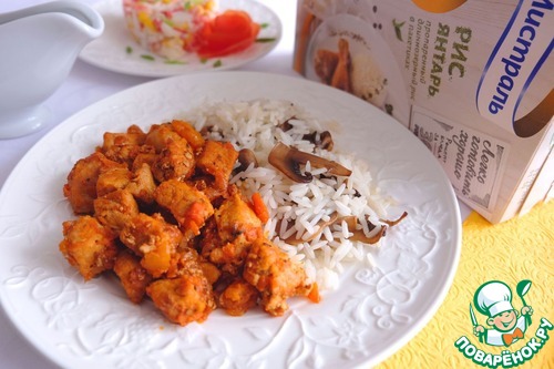 Настоящее удовольствие обеспечивает поджарка из свинины с фирменным рисом ТМ Мистраль "Янтарь" и грибами. Вместе получается очень гармоничное сочетание с насыщенным вкусом. Очень аппетитное блюдо к семейному застолью.