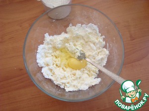 К маслу высыпаем сахарную пудру, соль, соду и разбиваем яйцо. Вилкой тщательно перемешиваем массу.