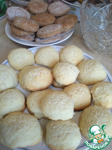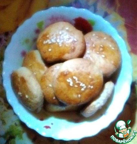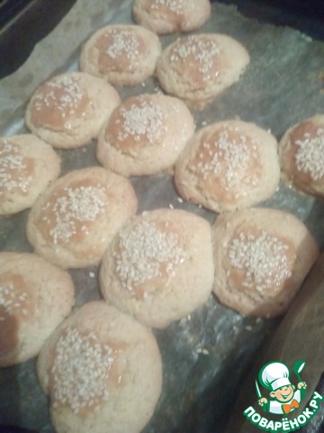 Смазываем верх желтком. Присыпаем кунжутом. В школе мы не присыпали. В трёх печеньках я сделала дырочки для оформления. Ставим в разогретую духовку до т-180 С на 10 минут. Как печенье зарумянится, то оно готово.