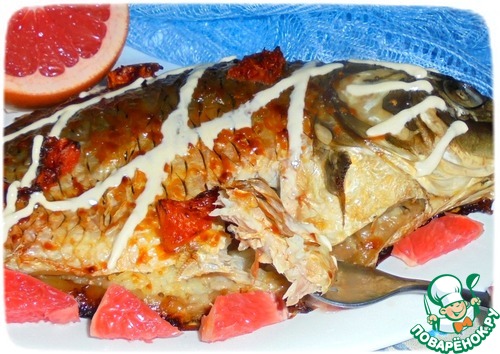 Для своих родных и любимых я частенько запекаю карпа в духовке и каждый раз экспериментирую с начинками и дополнениями. В этот раз я нафаршировала карпа рисом с чесноком и сверху покрыла рыбу дольками грейпфрута.