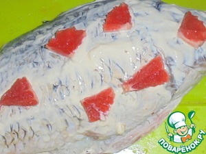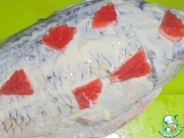 Грейпфрут очищаем и удаляем горькую шкурку. Несколько долек кладем внутрь рыбы, а остальные раскладываем по верху карпа.