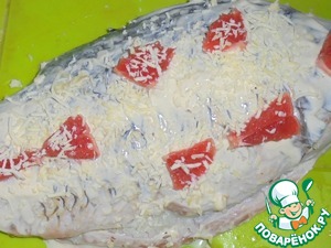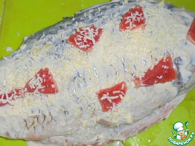 Сверху посыпаем тертым сыром. Помещаем рыбу в рукав для запекания, завязываем.
