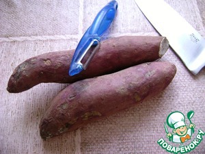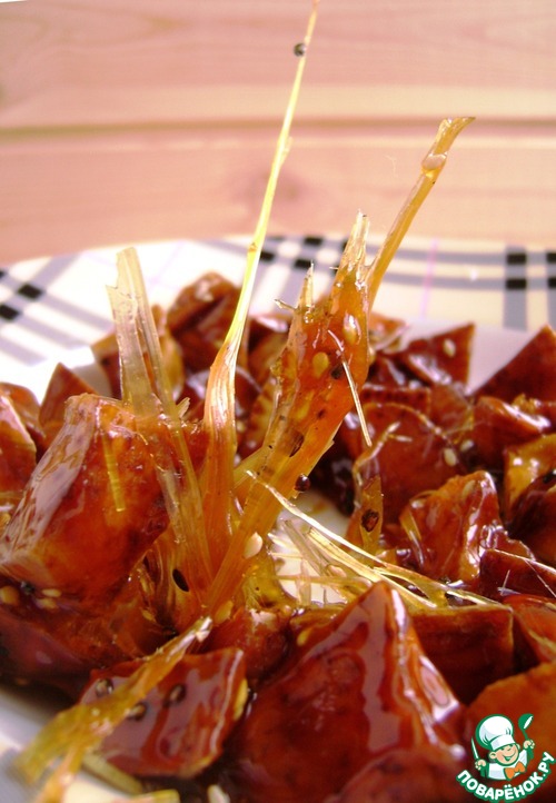 Быстренько выложить батат на чуть смазанное маслом блюдо и подавать тотчас же, дополнив мисочкой с ледяной водой, в которую надо обмакивать кусочек батата в горячей карамели.