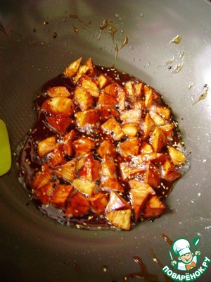 Быстро всыпать кунжут, выложить батат и, помешивая лопаточкой, покрыть весь батат слоем карамели.