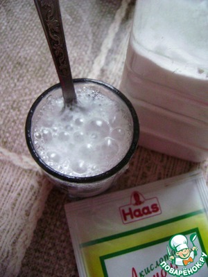 Развести лимонную кислоту (у меня ТМ «Haas») в трех столовых ложках воды и погасить соду.