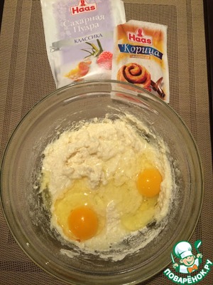 Разбиваем два яйца и снова хорошо перемешиваем. добавим ваниль и корицу по вкусу. Всыпаем муку и замешиваем тесто. Должно получиться не слишком густое.