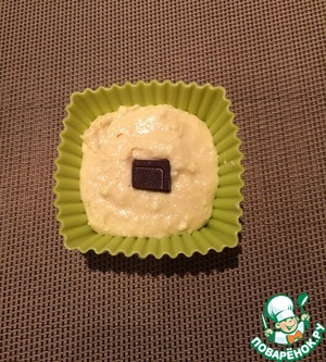 В силиконовую форму, смазанную маслом, кладем половину теста, посередке положим кусочек шоколада. Добавляем остаток теста в форму.