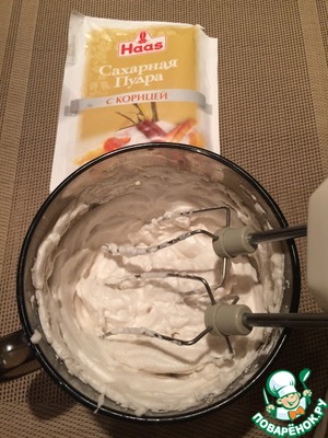 Теперь взбиваем белок и 4 ст. л. сахарной пудры с корицей Haas. Когда печенюшки немного подрумянятся, сверху аккуратно намажем безе и запекаем до готовности.