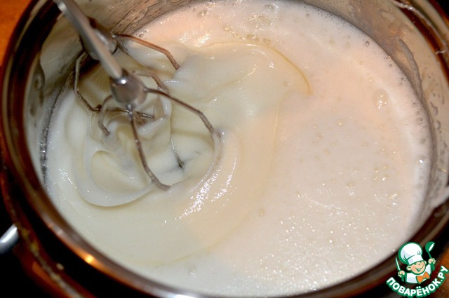 Поставьте ее на водяную баню. Взбивайте белки, постепенно подсыпая сахар, чтобы получилась густая, тягучая белая пена.