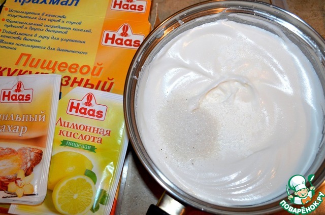Снимем миску, добавим ванильный сахар, лимонную кислоту и кукурузный крахмал. Еще немного повзбиваем смесь.