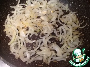 Лук порежем полукольцами или четверть кольцами (смотря какого размера луковица) и слегка обжарить на небольшом количестве масла до прозрачно-золотистого цвета.