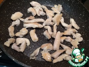 На этой же сковороде поджарить куриное филе, порезанное небольшими кусочками.