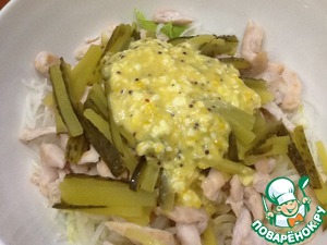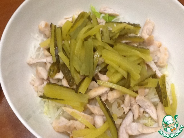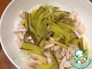 Порезать тонкими полосочками соленые огурчики.
