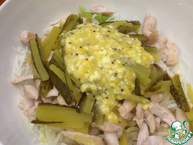 Добавим заправку в салат и размешаем.