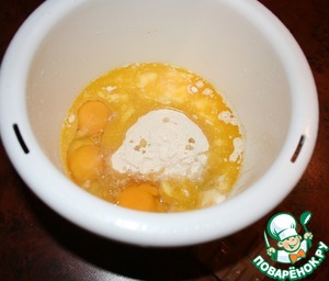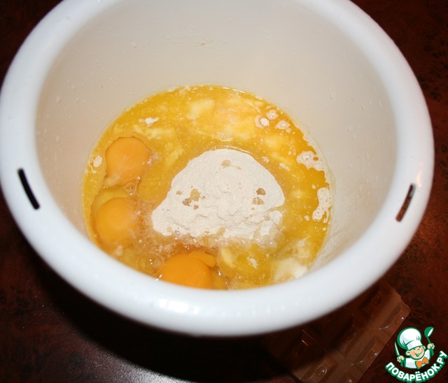 В чашу для миксера высыпаем пакетик смеси для кекса Haas, добаляем растопленное сливочное масло, молоко, яйца.