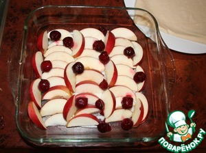 На дно формы для выпечки высыпаем сахар, сверху кладем резанные дольками яблоки и ягоды вишни.