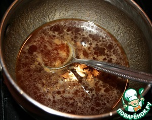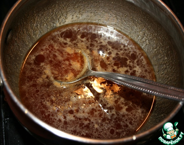 Готовим заливку: доводим до кипения мед и сахар, даем немного покипеть, постоянно помешивая