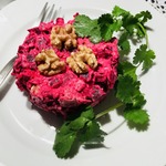 Предлагаю вкусный, нежный салат со свеклой, печеной индейкой и грецкими орехами. Получился сытный, полезный и очень вкусный салат. Совсем простой, доступный по продуктам и в приготовлении не занимает много времени. Индейку можно заменить на отварное куриное бедро, получится еще нежнее.