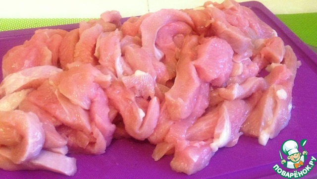 Филе грудки индейки обмыть. обсушить нарезать тонкими полосками. Лук нарезать кубиком. Морковь брусочками, если есть терка для корейской морковки лучше воспользоваться ей, и быстрее и брусочки красивие.
