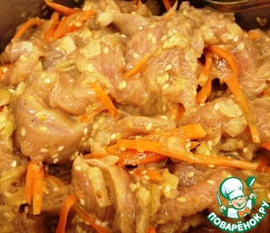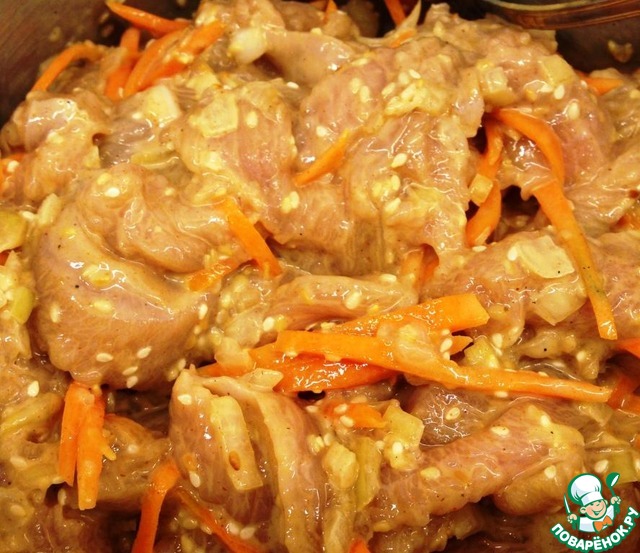 В миску достаточного размера положить: нарезанную индейку, лук, морковь, соус, чеснок, красный перец. Добавить яйцо, кунжут и крахмал и хорошенько перемешать. Дать помариноваться хотя бы мин 30 в холодильнике, Лучше на ночь.