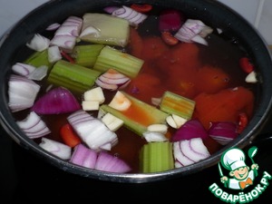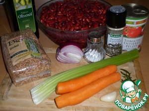 В большом количестве воды отварить фасоль с очищенными и произвольно нарезанными морковью, луком, сельдереем, томатами и чесноком.