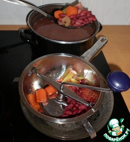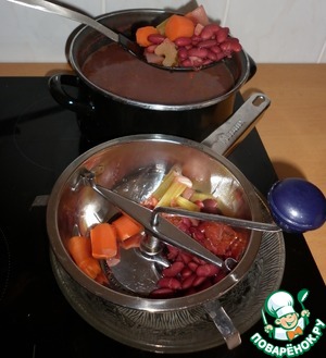 Как только фасоль и овощи будут готовы, достать их шумовкой из бульона и пюрировать.