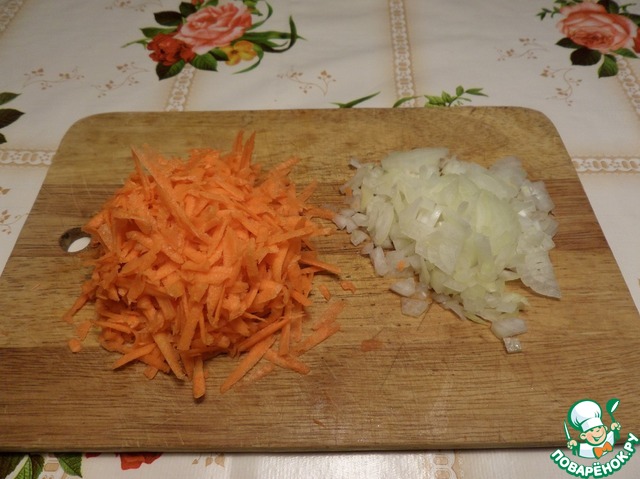 Нарезаем кубиком репчатый лук. Натираем морковь.