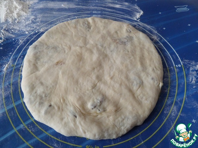 С помощью скалки или руками "мешочку" с начинкой придаем форму лепешки. (Диаметр - 24 см)