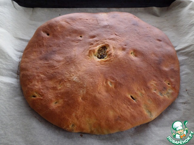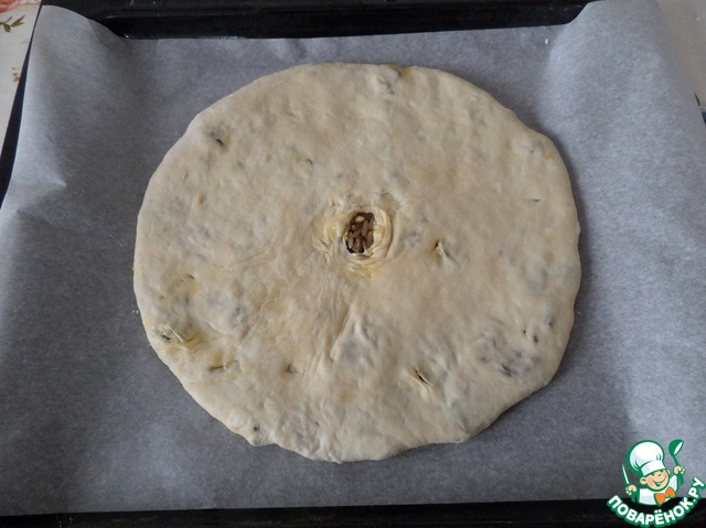 Выкладываем пирог-лепешку на противень, застеленный пергаментом. В центре пирога делаем отверстие.