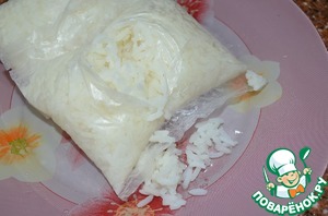 • В это время отварить рис. Очень удобно использовать пакетированный рис от ТМ Мистраль. Сегодня рис Янтарь. Согласно инструкции варить 30 минут.