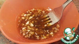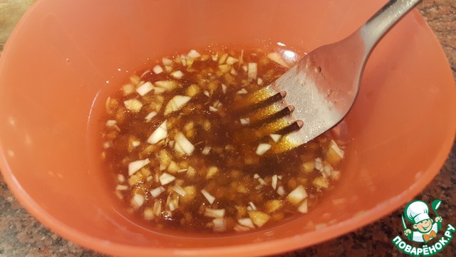 Пропустить чеснок через чеснокодавку или мелко нарезать и добавить в маринад. Добавить кукурузное масло, джем и уксус.