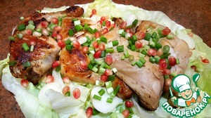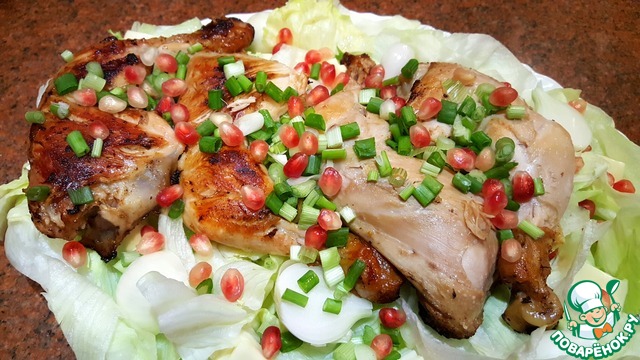 Выложить готовые окорочка на айсберг, посыпать нарезанным зелёным луком и зернами граната.