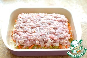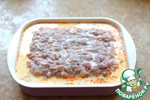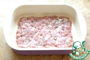 Дно формы смазать маслом, выложить половину фарша, отступая от краев.