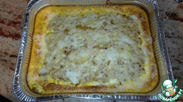 Готовое блюдо вынуть и присыпать сухарями (можно посыпать тертым сыром и зарумянить вместе с ним, но у меня такой сыр не ест ребенок, поэтому я добавлять его не стала). -