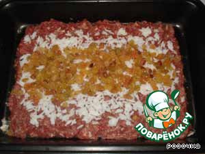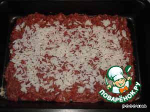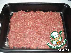 Равномерно раскладываем фарш слоем в 1 см толщиной.