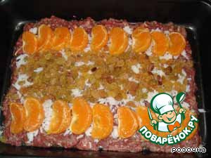 Нежный мясной рулет, фаршированный рисом, сладким изюмом, ароматным мандарином и запеченный в духовке до румяной корочки. Ням-ням. Попробуйте, не пожалеете.
