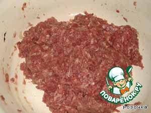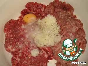 В фарш (у меня был говяже-свиной) добавляем лук, 1 яйцо, соль, перец (по вкусу).